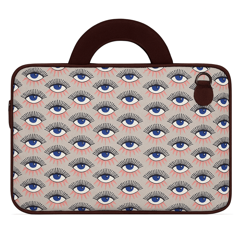 احمِ جهازك بأناقة مع حقيبة اللابتوب القماشية بلون بيج مزخرفة بنقوش عيون جريئة. مصنوعة من قماش قطني متين باللون البيج الناعم، وتتميز بنقشة كاملة لرموز عين مع قزحية زرقاء، ورموش سوداء، ولمسات شمسية بلون كورال. يضيف المقبض العلوي المستدير الملفوف بالقماش العنابي والحواف المتطابقة لمسة لونية جذابة، بينما يحافظ السحاب العلوي على أمان جهازك وأغراضك الأساسية. يوفر الداخل مقصورة مبطنة وجيب مفتوح لتنظيم اللابتوب، والشاحن، والدفاتر. مثالية للعمل، أو المدرسة، أو السفر، حيث تجمع بين التصميم المرح والحماية العملية.
