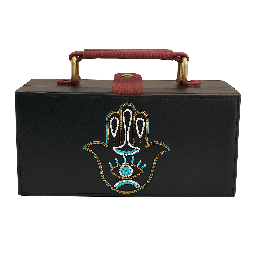 Add a touch of spiritual style with our Black Beaded Hamsa Hand Canvas Clutch. Crafted from durable black cotton canvas, this structured rectangular bag is trimmed in sleek faux-leather and features an intricately beaded Hamsa (Hand of Fatima) motif in ivory, gold, and teal seed beads. The burgundy canvas-wrapped top handle and brass-tone hardware provide refined contrast, while a magnetic snap closure opens to reveal a roomy interior with a zippered pocket—perfect for keeping your phone, cards, and cosmetics organized. Ideal for evening events, cultural gatherings, or adding a meaningful accent to everyday outfits, this clutch blends artisan craftsmanship with modern flair.