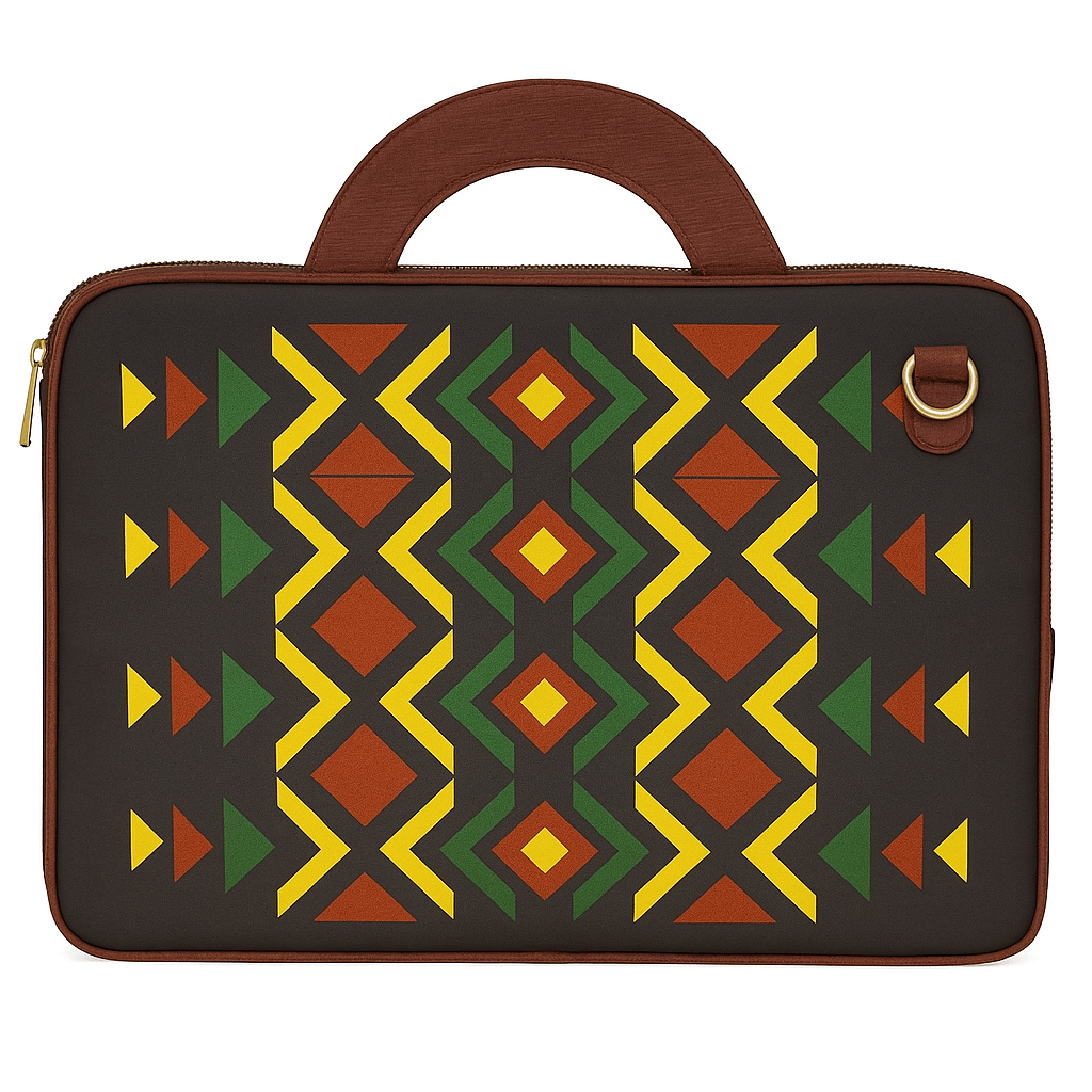 احمِ حاسوبك المحمول بأناقة مع حقيبة لابتوب قماشية سوداء وبنية بنمط هندسي. مصنوعة من قماش قطني متين باللون الأسود الأنيق، مزينة برسوم قبلية جريئة بالأصفر الخردلي، والأخضر الغابي، والترابيات الأحمر. يضيف المقبض العلوي الملفوف بالقماش البني والحواف المتطابقة تباينًا دافئًا، بينما يحافظ السحاب العلوي على أمان جهازك. يوفر الداخل مقصورة مبطنة وجيبًا مفتوحًا لتنظيم اللابتوب، والشاحن، والأغراض الأساسية بسهولة. مثالية للعمل، أو المدرسة، أو السفر، حيث تجمع بين التصميم المميز والحماية العملية.