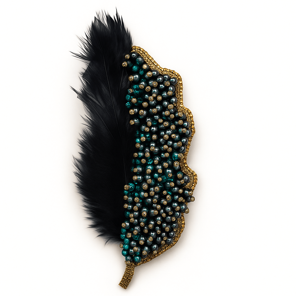Elegant feather-shaped accessory with black feathers and emerald-gold beaded detailing for a luxurious artistic touch.