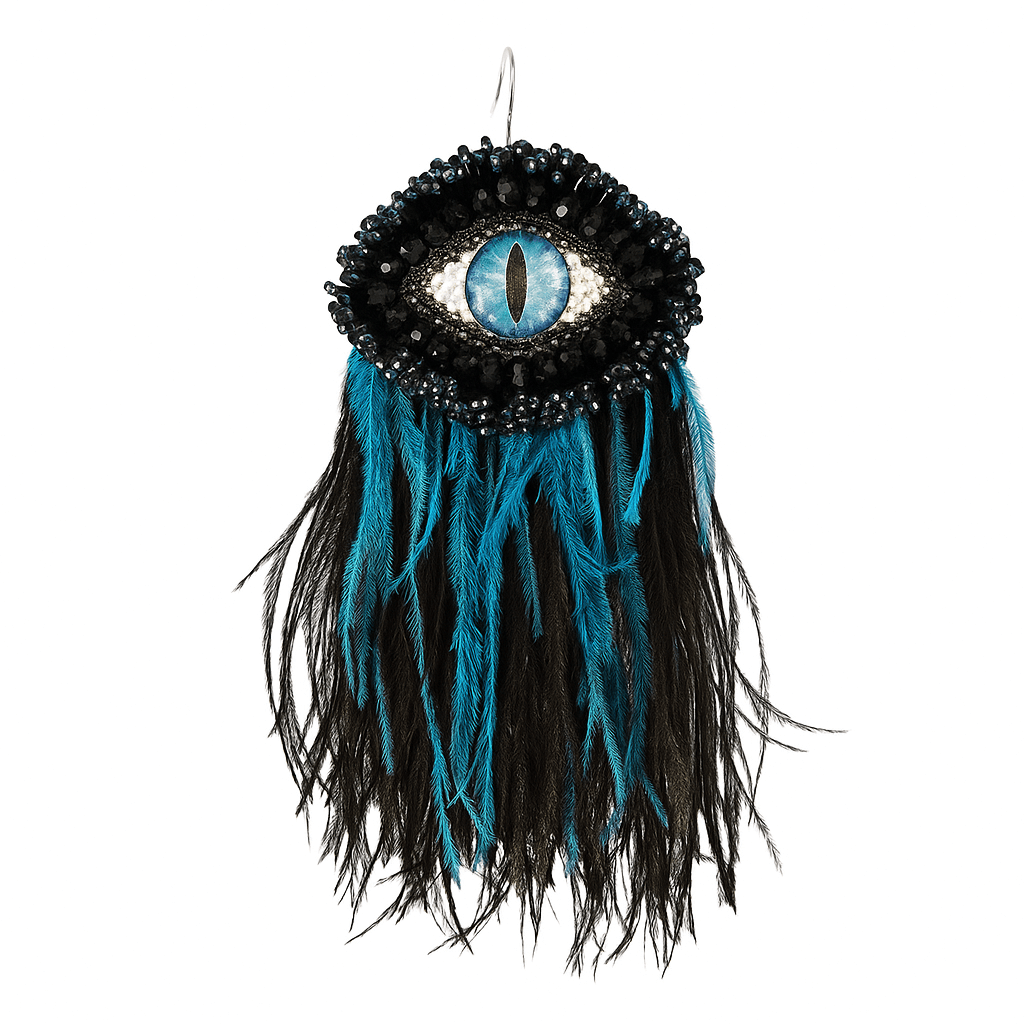 Make a striking statement with this Teal & Black Feathered Evil Eye Drop Earring. Featuring a central cat-eye glass cabochon in vivid aqua and onyx tones, it’s framed by concentric rings of ivory seed beads and jet-black faceted beads for luminous contrast. Below the beaded eye, layers of soft teal and black feathers cascade in a dynamic fringe, creating fluid movement with every turn. Suspended from a sleek silver-tone hook, this artisan earring offers an eye-catching blend of protective symbolism and avant-garde flair—perfect for festivals, evening events, or elevating any look with bold, boho-chic style.