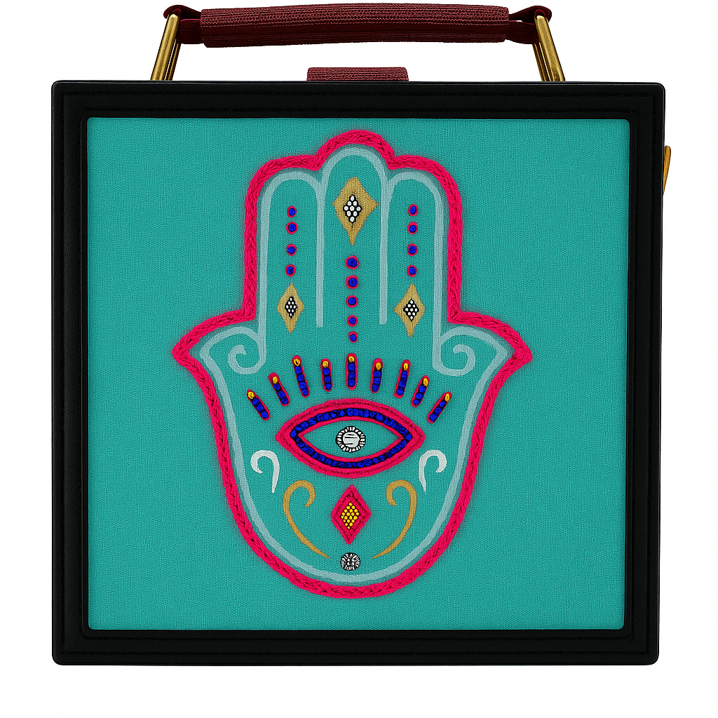 أضيفي لمسة من الطاقة الإيجابية إلى إطلالتك مع كلاتش قماشي تركوازي مزخرف برمز هلسما (يد فاطمة). مصنوع من القماش القطني المتين بلون تركوازي زاهٍ، ويظهر نقش الهلسما بتحديد خارجي وردي نابض وحشوة من الخرز الأصفر الذهبي والكحلي لرمز واقٍ ومشرق. يكتمل التصميم بمقبض علوي ملفوف بالقماش الأحمر وإطار أسود أنيق من الجلد الصناعي مع لمسات معدنية ذهبية. يوفر الداخل مساحة واسعة لهاتفك وبطاقاتك والأغراض الأساسية، وجيبًا بسحاب لحفظ الأغراض الصغيرة. مثالي لإضفاء لمسة بوهو-شيك على المهرجانات، والعشاءات، أو الإطلالات اليومية.
